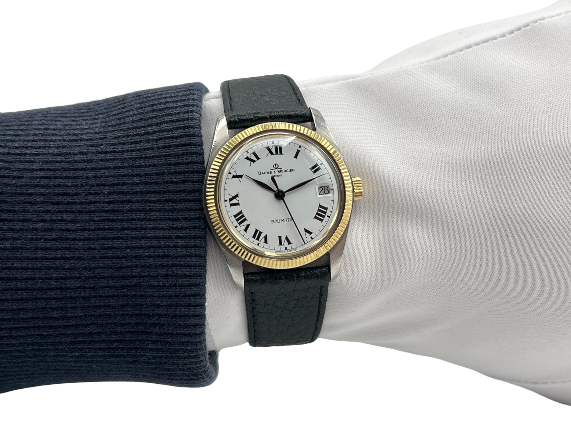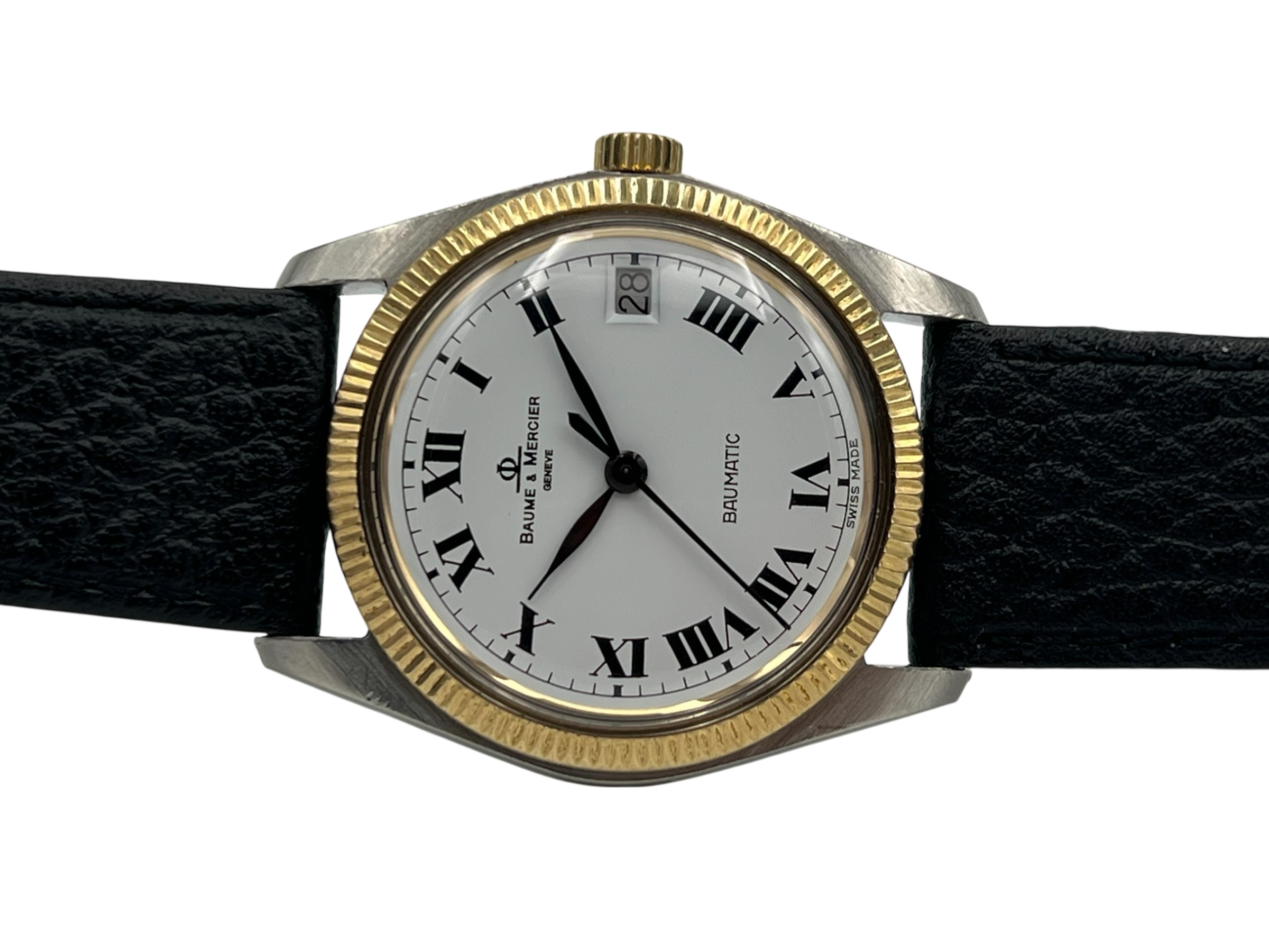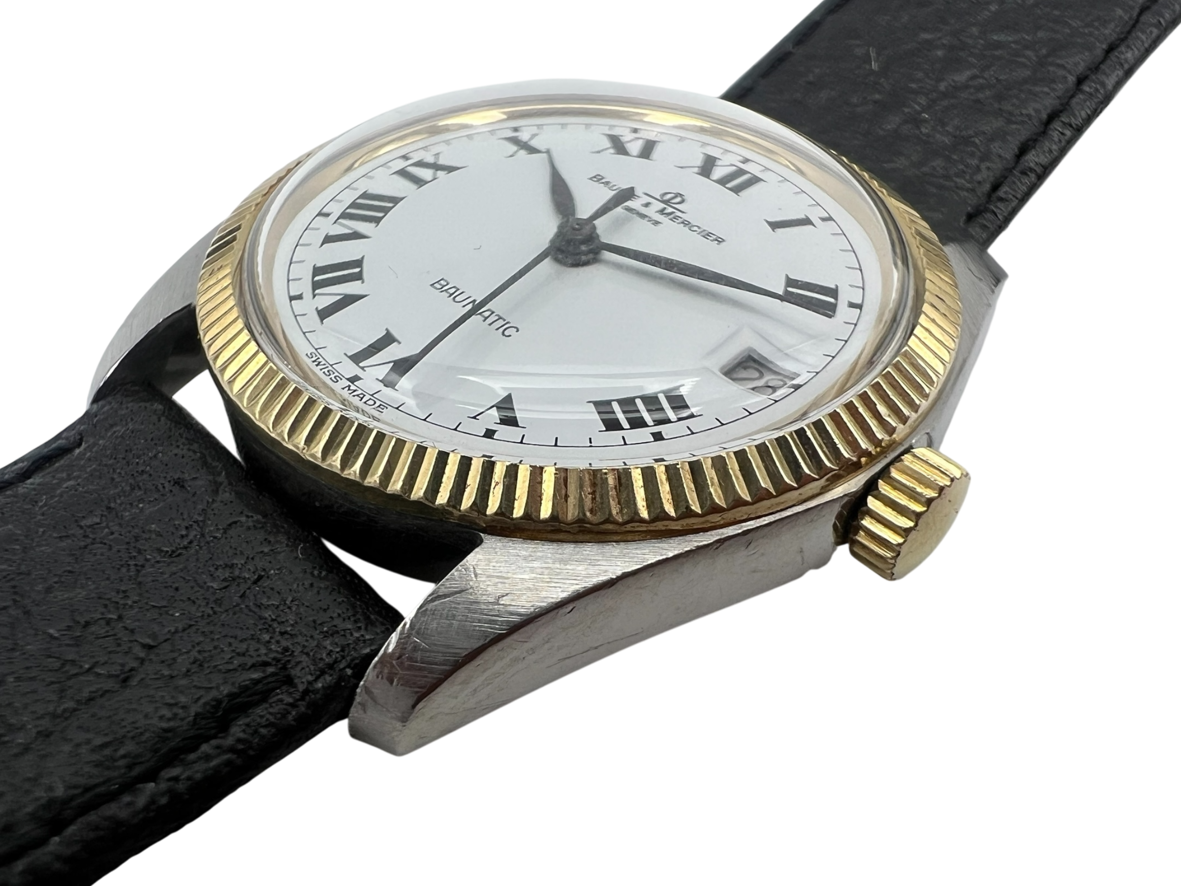 Die Baume & Mercier Baumatic 1181.1 überzeugt mit einem klassischen Design und einer fein geriffelten Lünette, die dem Gehäuse eine edle Ausstrahlung verleiht. Schwarze römische Ziffern auf weißem Zifferblatt unterstreichen den zeitlosen Charakter dieser Vintage-Uhr. Das Gehäuse weist mittlere Gebrauchsspuren auf, das Plexiglas wurde fachgerecht ersetzt (nicht original).