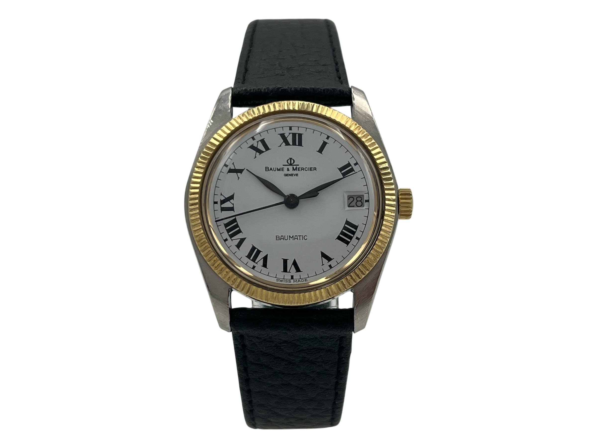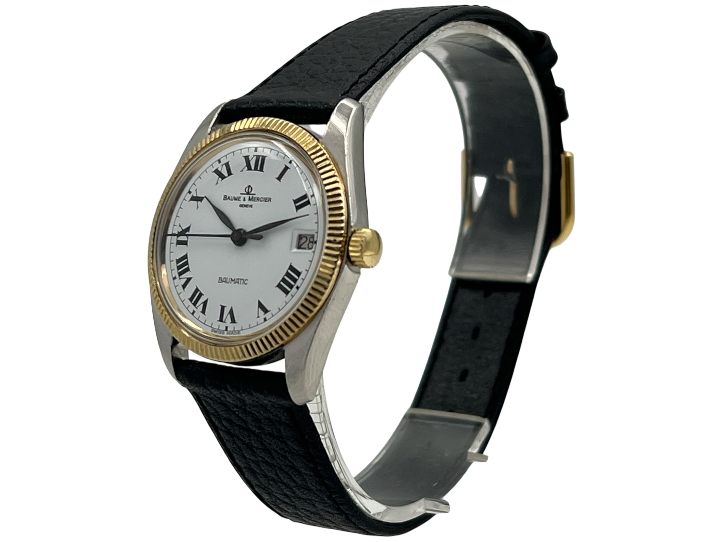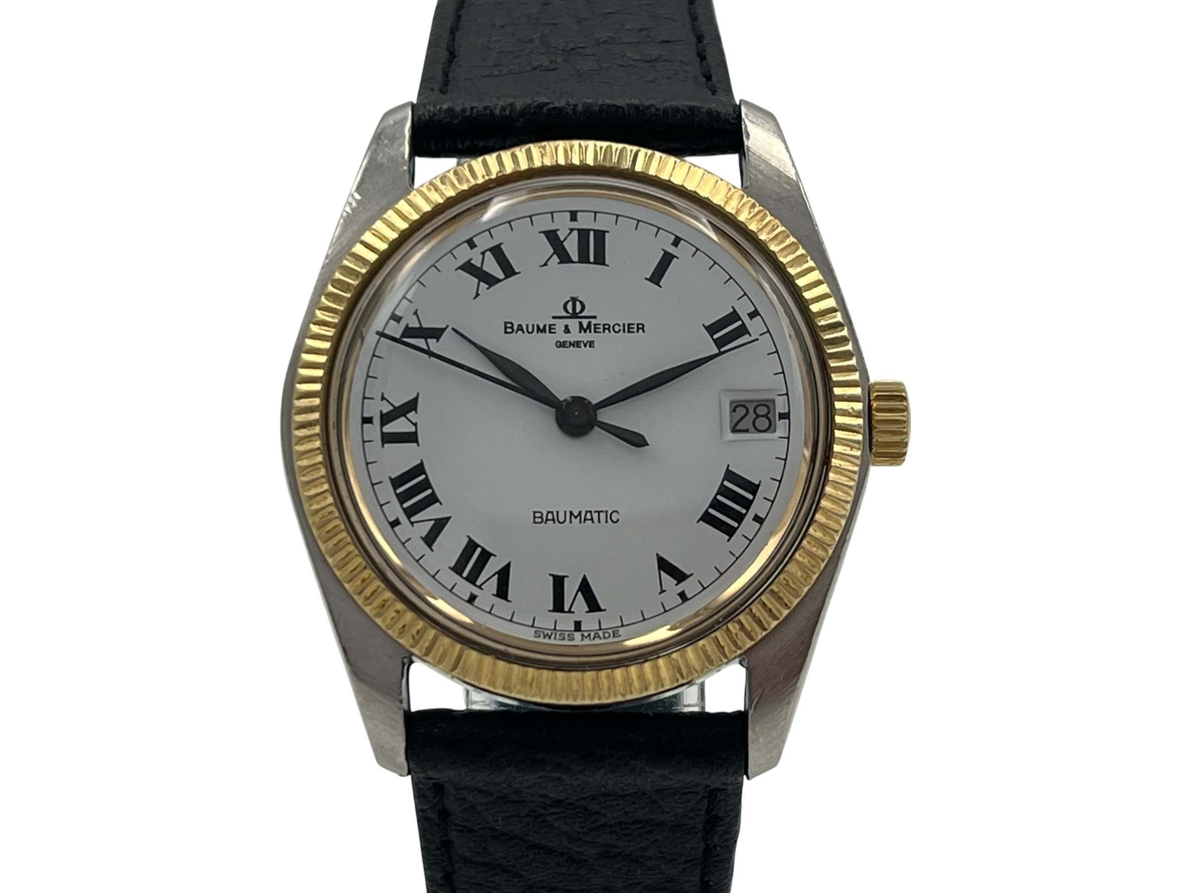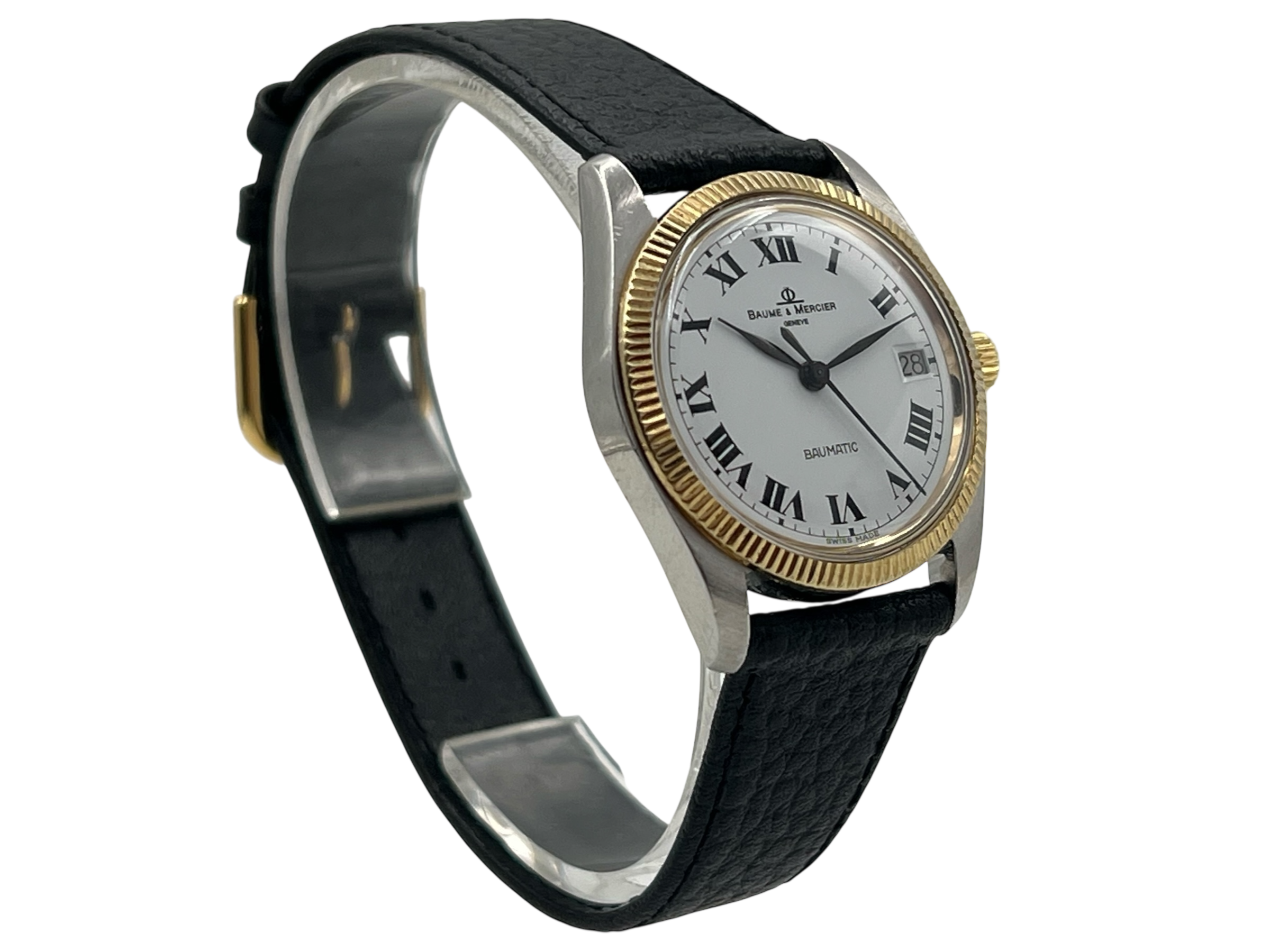 Die Baume & Mercier Baumatic 1181.1 überzeugt mit einem klassischen Design und einer fein geriffelten Lünette, die dem Gehäuse eine edle Ausstrahlung verleiht. Schwarze römische Ziffern auf weißem Zifferblatt unterstreichen den zeitlosen Charakter dieser Vintage-Uhr. Das Gehäuse weist mittlere Gebrauchsspuren auf, das Plexiglas wurde fachgerecht ersetzt (nicht original).